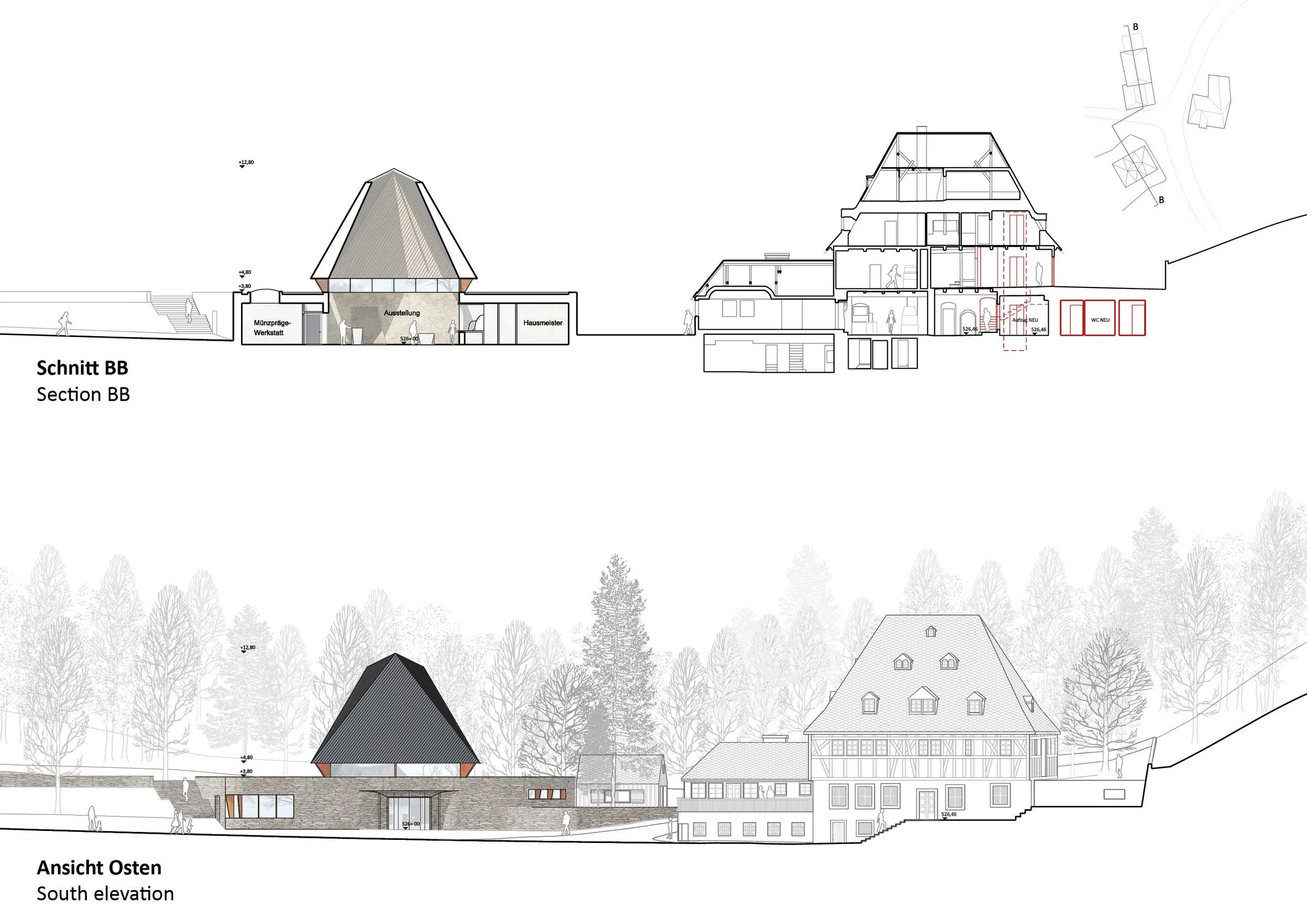 - Eine enge Verbundenheit mit der Erde, die hier nicht nur als Boden wahrgenommen wird, sondern als produktiver und bewohnbarer Raum. Diese für Bergbaugegenden typische Beziehung manifestiert sich auf dem Wettbewerbsgrundstück an vielen Stellen. Zum Beispiel in der Art und Weise, wie das Hammerwerk unter das Niveau der Wasserrinne in den Hang eingegraben ist, um die Wasserenergie zu nutzen oder in dem Netz aus Stützmauern, die das Gelände modellieren und ein spannungsvolles Verhältnis zwischen Landschaft und Architektur generieren.
